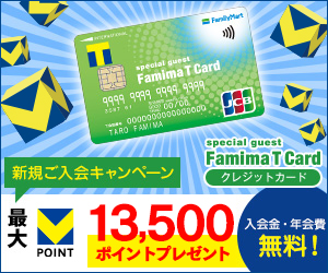 ファミマTカードに興味を持たれた方は,下記バナーからお申し込みをどうぞ。下記バナーからのお申し込みで,いまなら10,000円以上使用で2,000Tポイント,携帯電話料金支払いで1,000Tポイント,電気料金支払いで1,000Tポイントの計4,000Tポイントがもらえるキャンペーンをやっています。