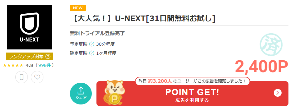 こちら,U-NEXTは,無料お試し登録完了だけで15分程度でポイント付与となっています。